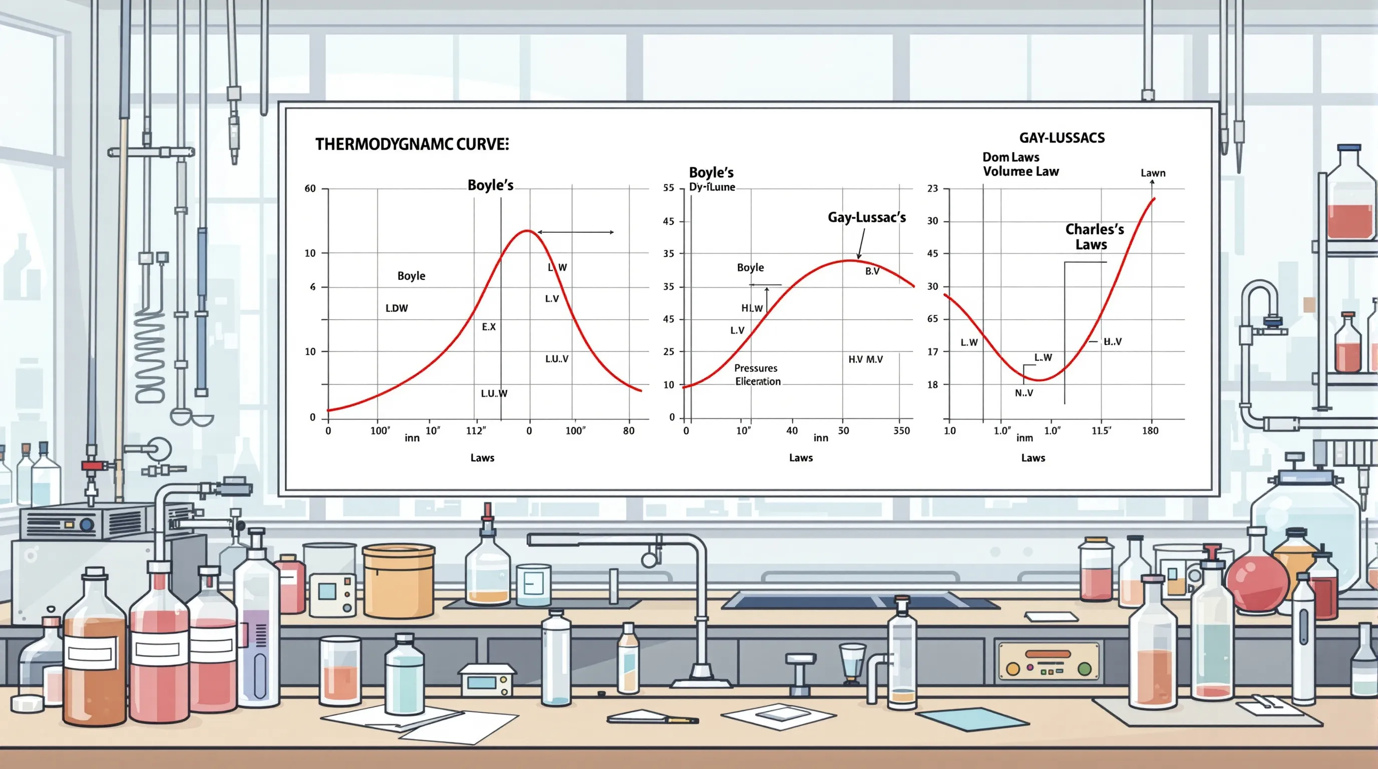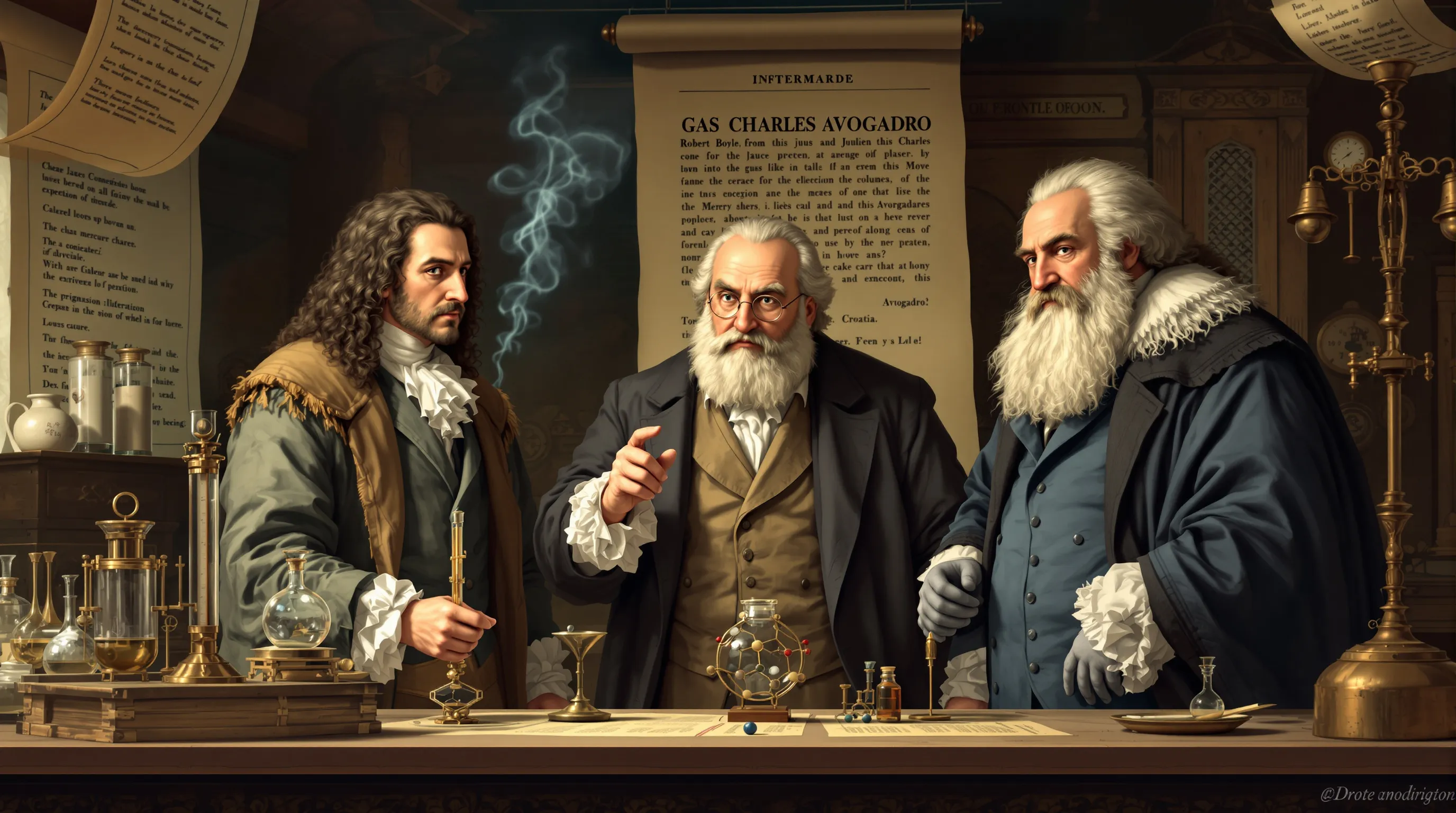 Tri znanstvenika iz različitih stoljeća postavila su temelje modernoj termodinamici kroz eksperimente s plinovima. Robert Boyle eksperimentirao je 1662. godine s živinim stupcem i ustanovio inverzan odnos tlaka i volumena. Jacques Charles proučavao je 1787. godine ekspanziju plinova pri zagrijavanju. Amedeo Avogadro formulirao je 1811. godine hipotezu o jednakom broju molekula u jednakim volumenima različitih plinova.